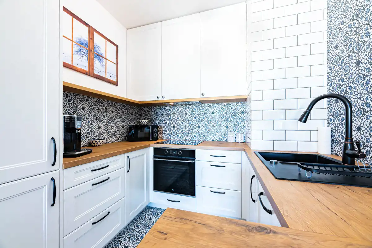 Aneks kuchenny z zabudową na wymiar. Pełne wyposażenie AGD (zmywarka 60 cm, piekarnik, płyta indukcyjna, ekspres ciśnieniowy do kawy, mikrofala, piekarnik, pochłaniacz).