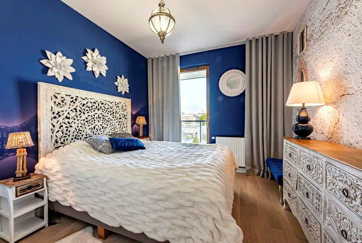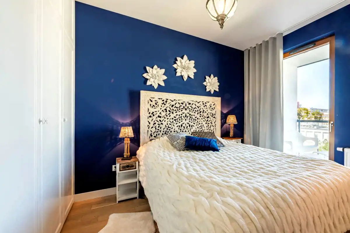 Sypialnia wyposażona w dużą szafę i łóżko z materacem 160 x 200. Dodatkowo stylowa komoda z szufladami, siedzisko, stoliki nocne. Elementy dekoracyjne, zasłony, dywan, dekoracje ścienne, liczne punkty oświetleniowe dodają wnętrzu dużo przytulności.
