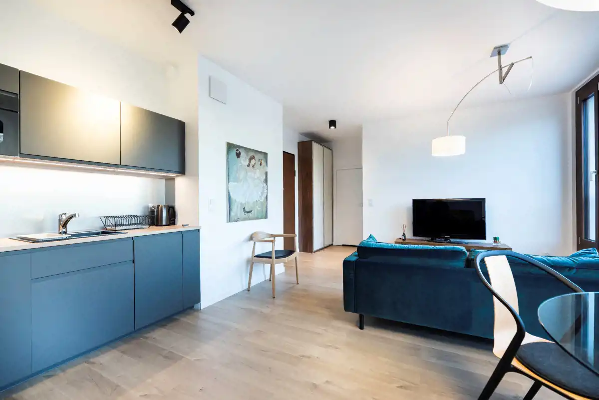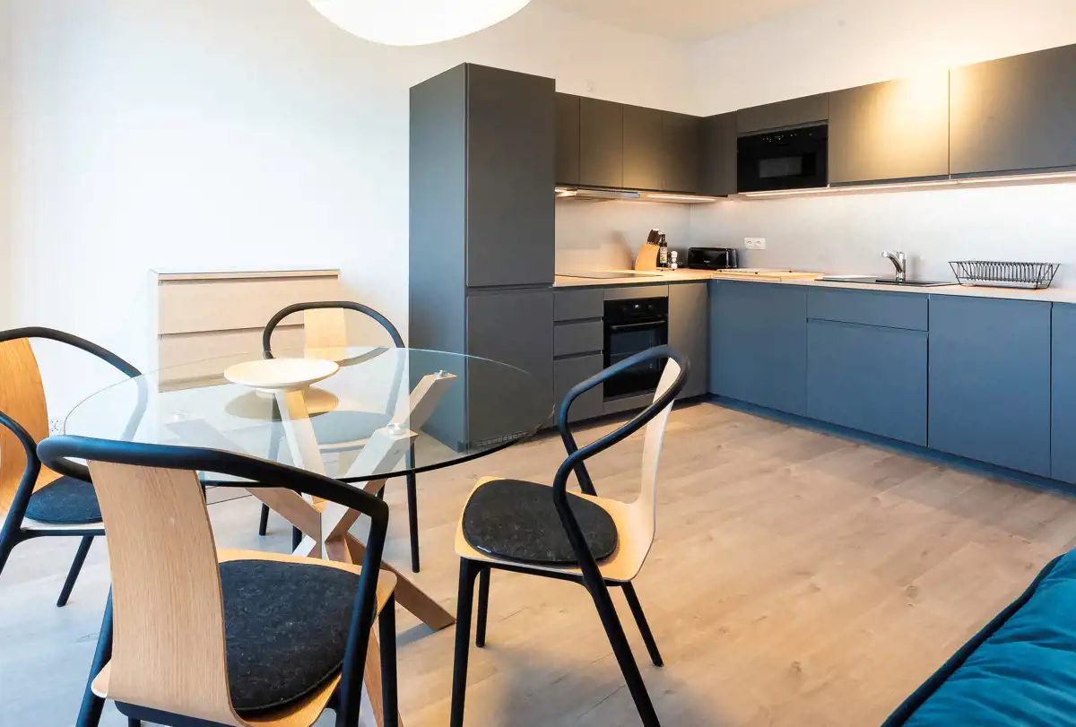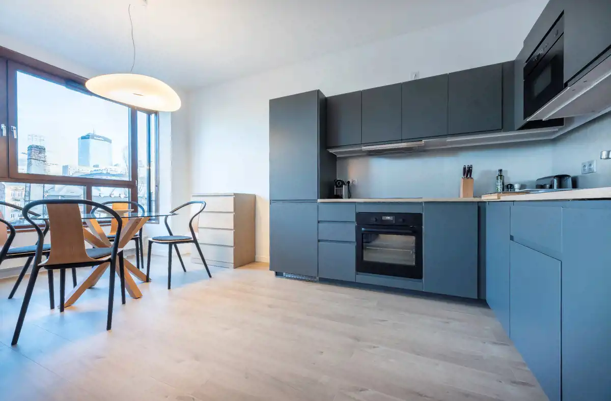 W kuchni nowoczesna zabudowa kuchenna, pełne wyposażenie AGD (kuchnia elektryczna, piekarnik, zmywarka, lodówka, wyciąg kuchenny).