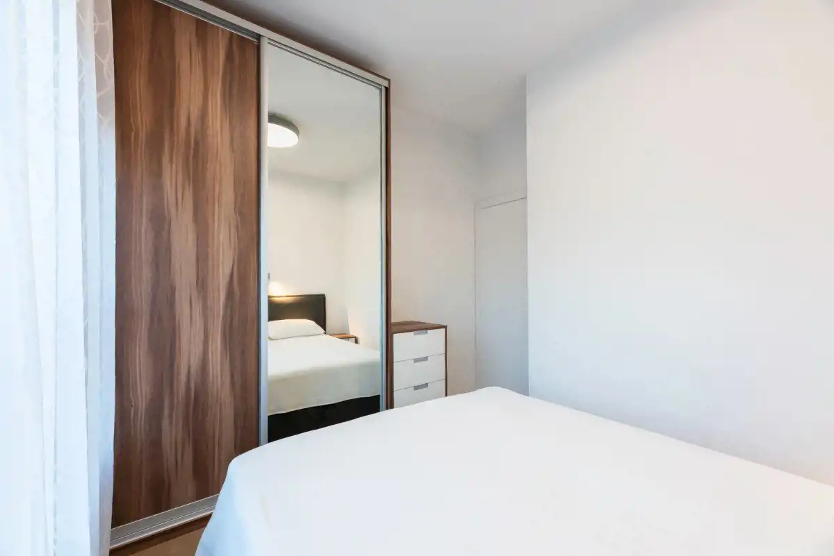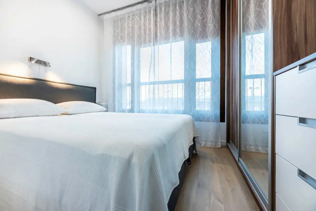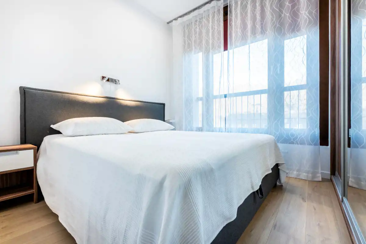 W sypialni wygodne łóżko kontynentalne, pojemna szafa.
