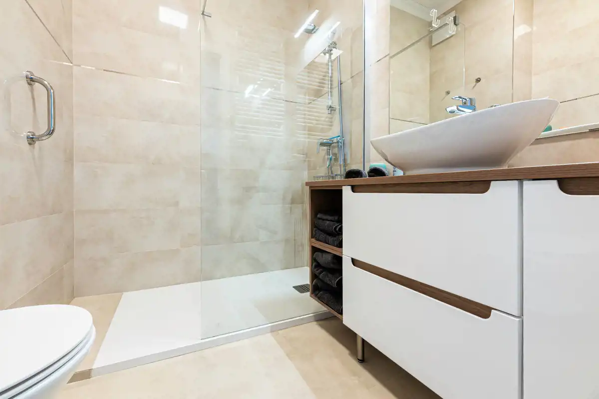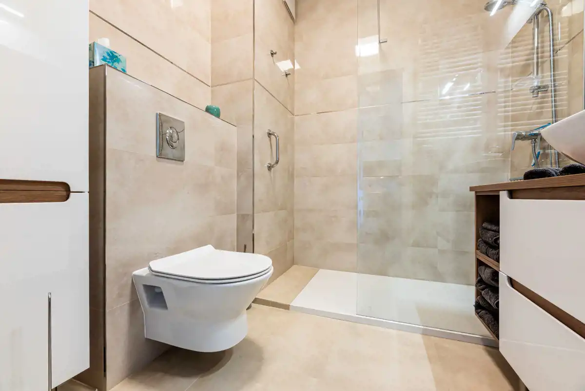 Łazienka z prysznicem, toaletą. Pralka. Pod umywalką szafki z szufladami.