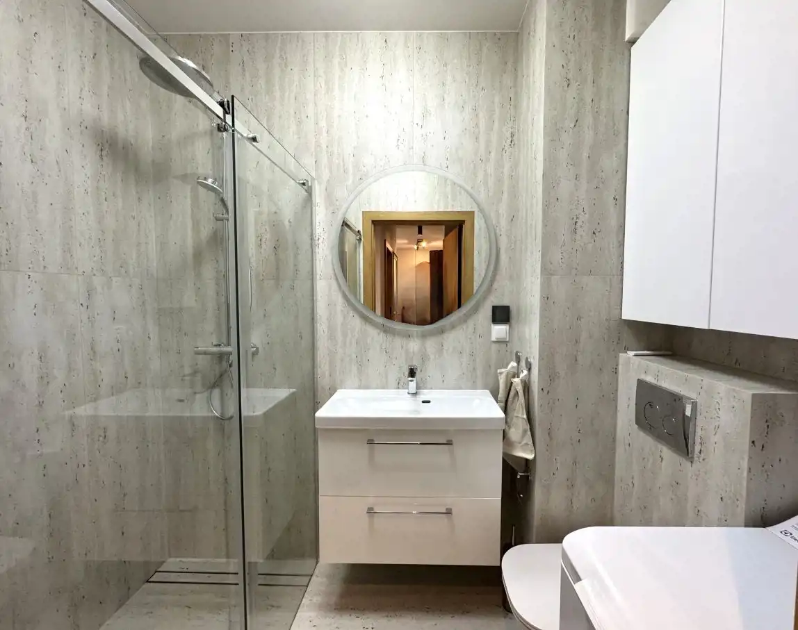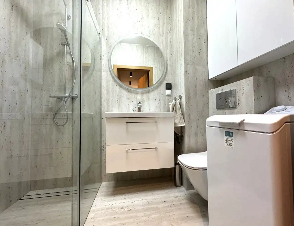 Łazienka: przestronna kabina prysznicowa, pralka, wc, umywalka, szafki.
