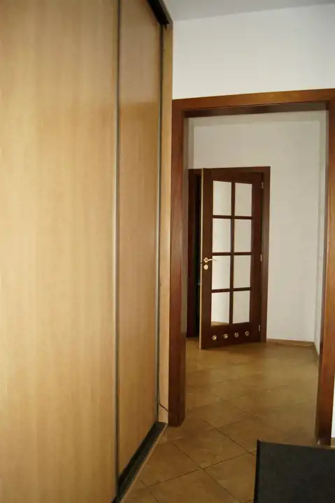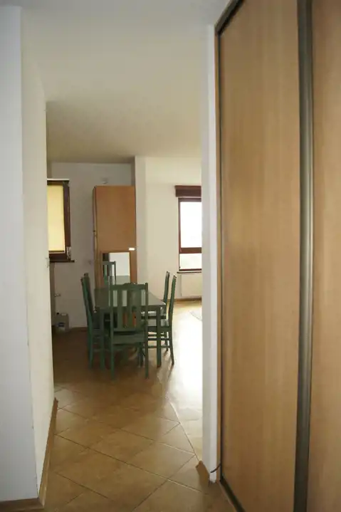Widoczne na zdjęciach stół z krzesłami oraz dwie skórzane sofy do siedzenia i w przedpokoju szafa Komandor stanowią wyposażenie lokalu.