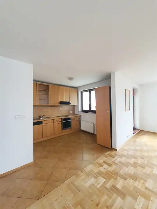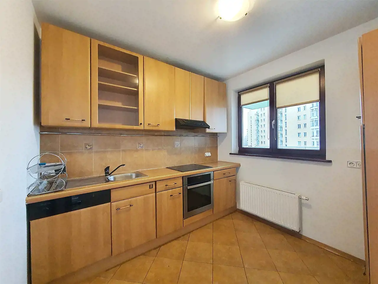 Kuchnia (otwarta na pokój) jest wyposażona w szafki i sprzęt AGD (lodówka, płyta ceramiczna, piekarnik, wyciąg, zmywarka do naczyń). Nie ma pralki.