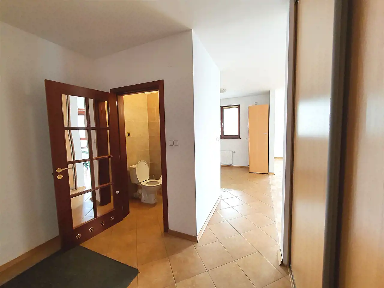 W wyposażeniu są jedynie widoczne na zdjęciach - stół z krzesłami oraz dwie skórzane sofy do siedzenia, a w przedpokoju szafa Komandor.