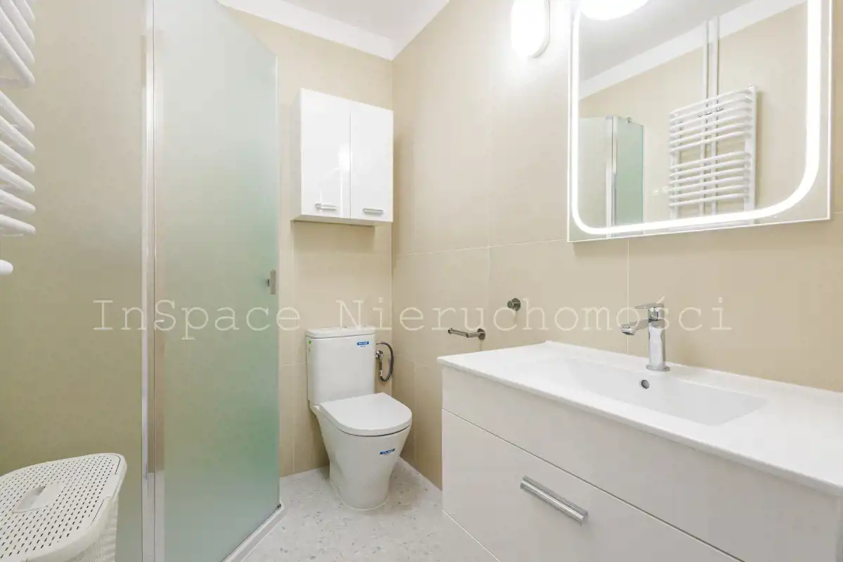- łazienka – prysznic, umywalka z szafką, WC, lustro.