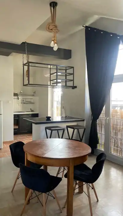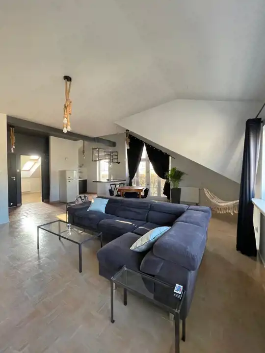 Mieszkanie częściowo z meblami ( w pokoju dziennym jest kanapa, komoda, stoliki okolicznościowe, stół, hamak). W sypialni jest szafa garderobiana, nie ma łóżka. Pokój gabinet bez mebli.