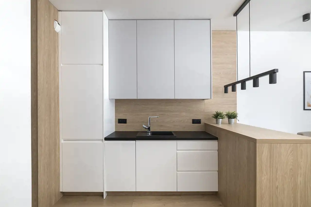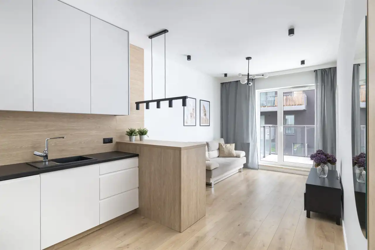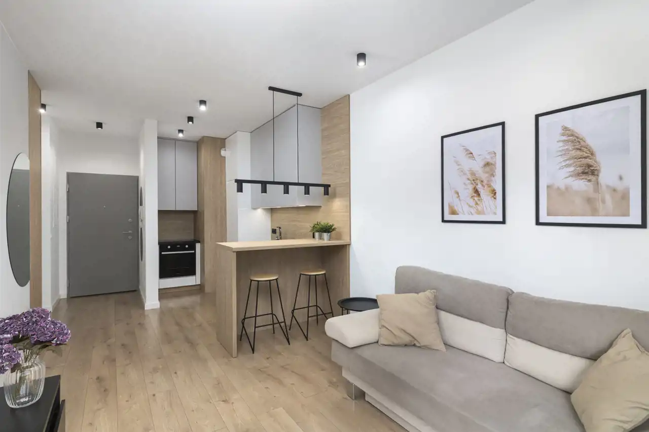 - salonu z aneksem kuchennym (ok. 19 m²) – wyposażonego w zabudowę kuchenną z pełnym zestawem AGD: zmywarkę, piekarnik, płytę indukcyjną, lodówko-zamrażarkę i okap. W części dziennej znajduje się wygodna sofa, stolik kawowy, telewizor oraz stół z krzesłami,