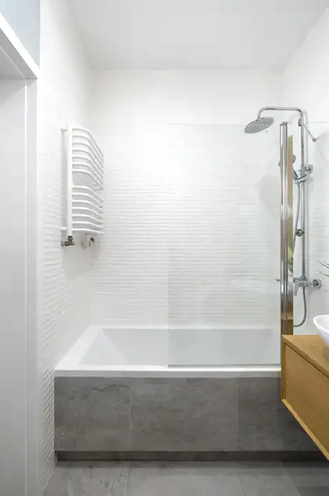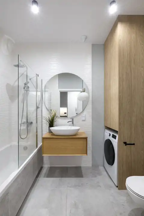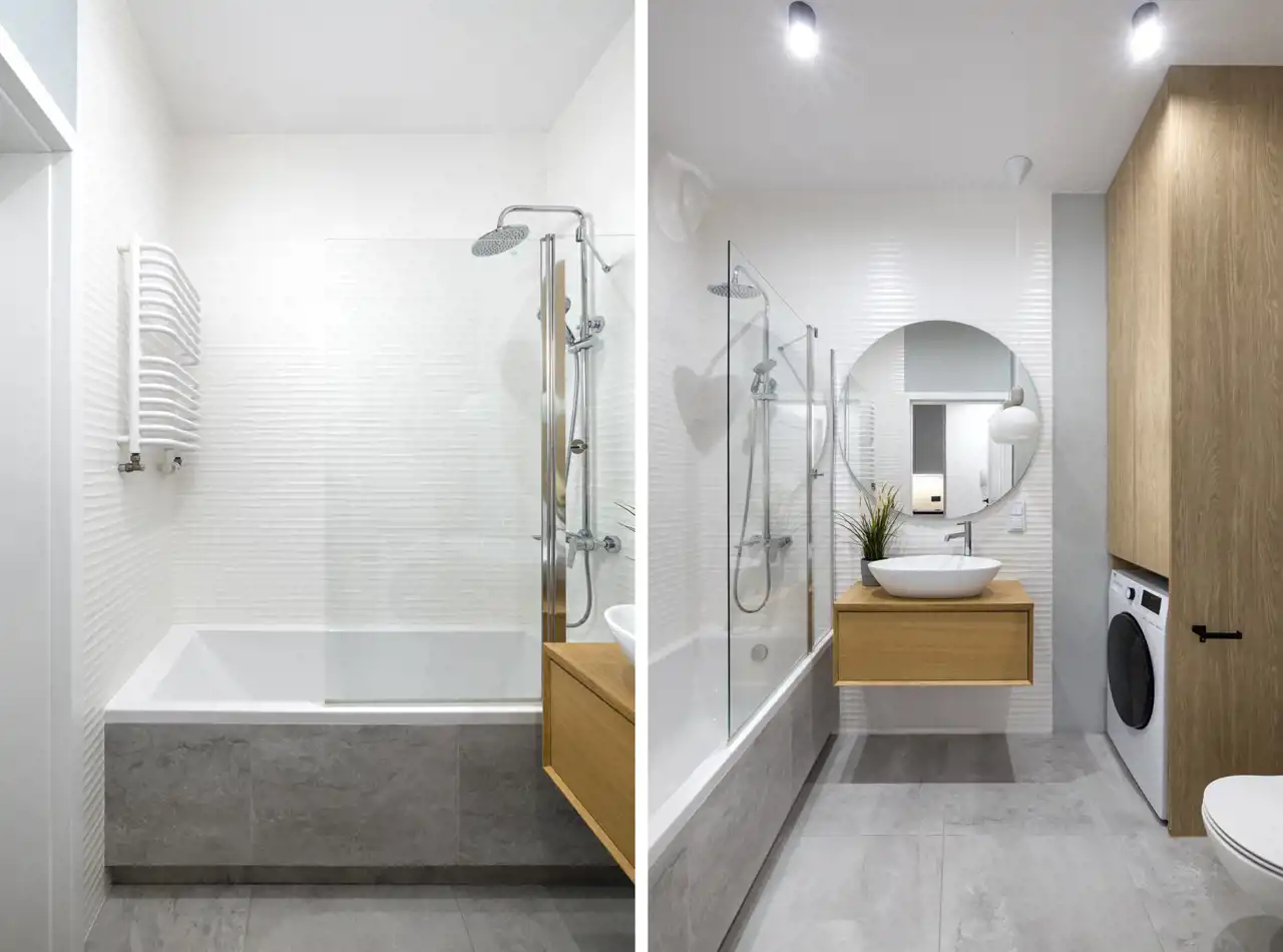 - łazienki (ok. 4 m²) – z WC, wanną z funkcją prysznica, pralką,