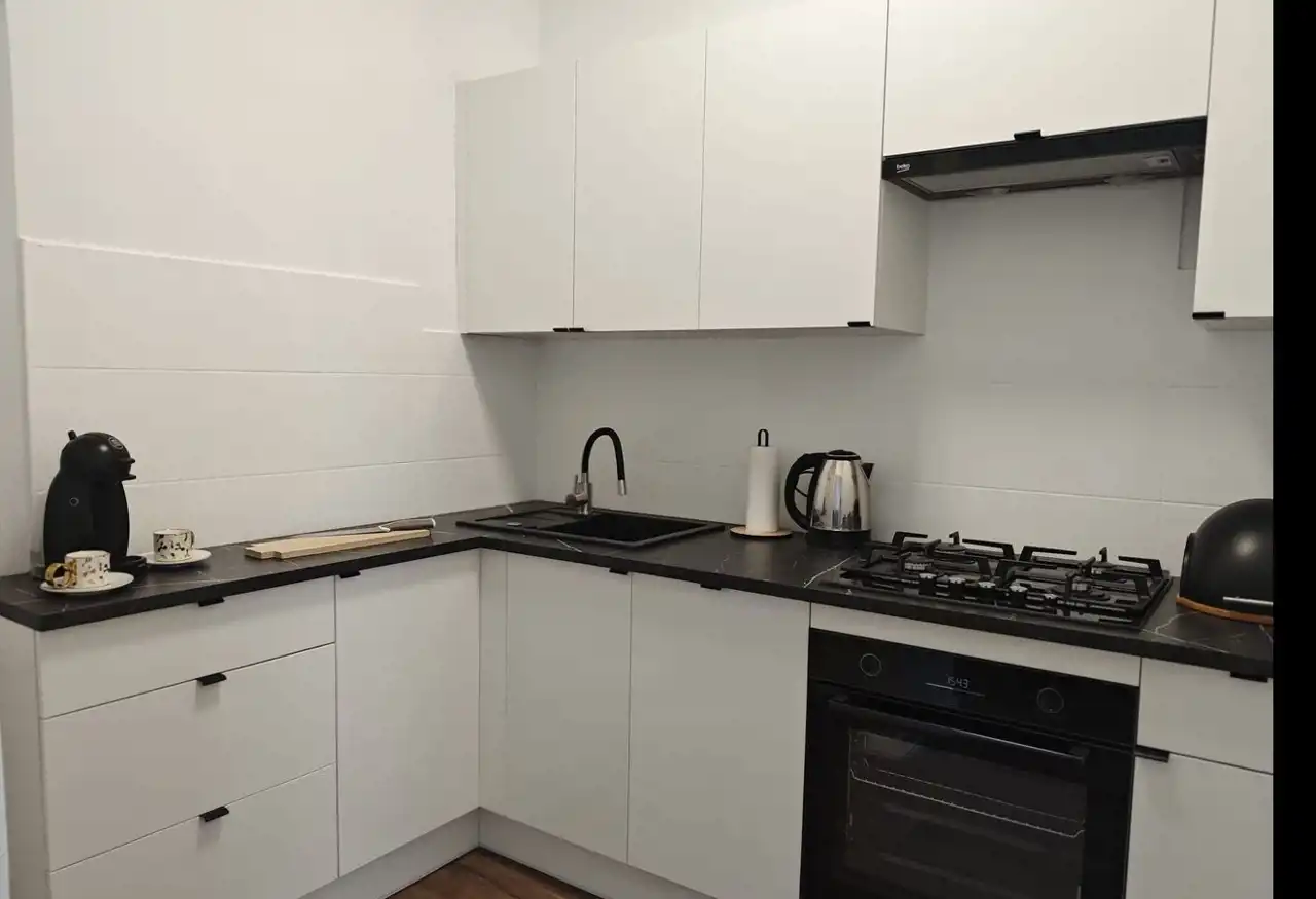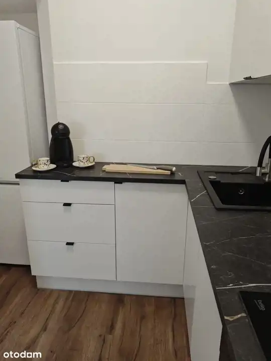 Kuchnia: nowe sprzęty AGD firmy Beko (lodówka, piekarnik, płyta, zmywarka), szafki kuchenne, pełne wyposażenie.