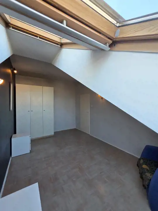 W całym mieszkaniu występuje dużo skosów i okien dachowych.