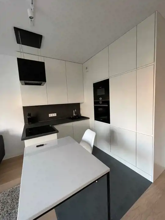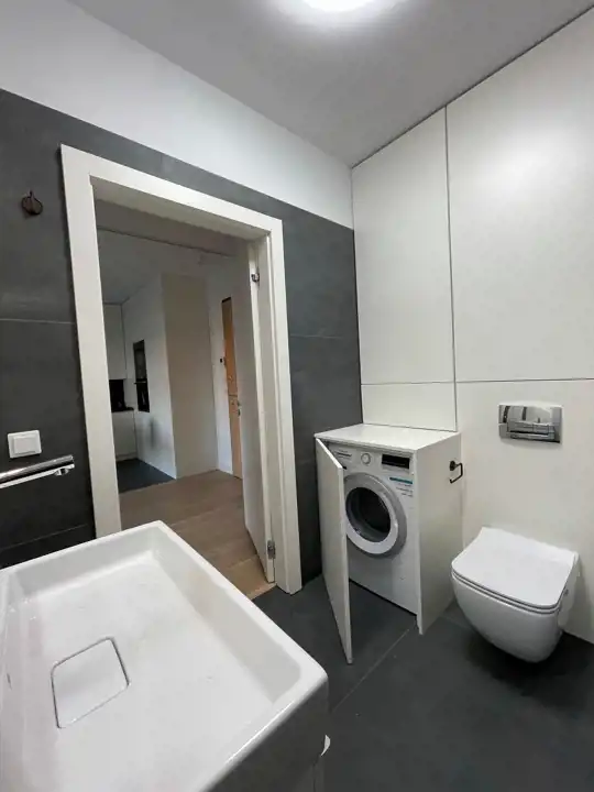 -Kuchnia: w zabudowie z pełnym AGD (lodówka, zmywarka, piekarnik, mikrofalówka, płyta indukcyjna, okap kuchenny).