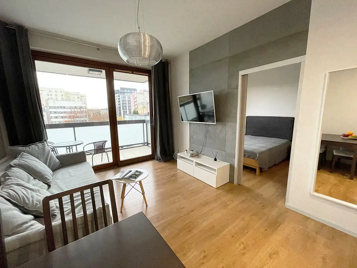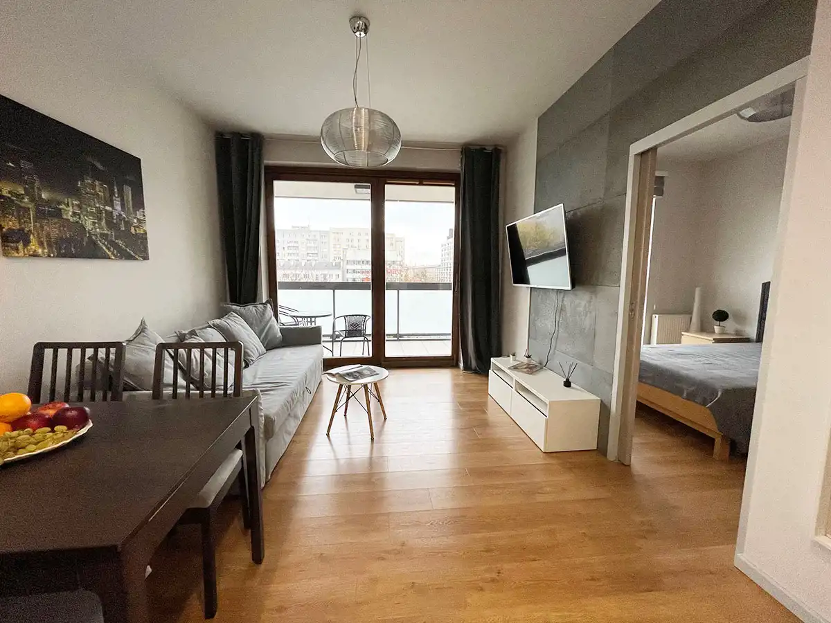 Salon umeblowany w stół z krzesłami, TV 55 cali, rozkładaną sofę, stolik kawowy, szafkę RTV oraz z wyjściem na balkon.