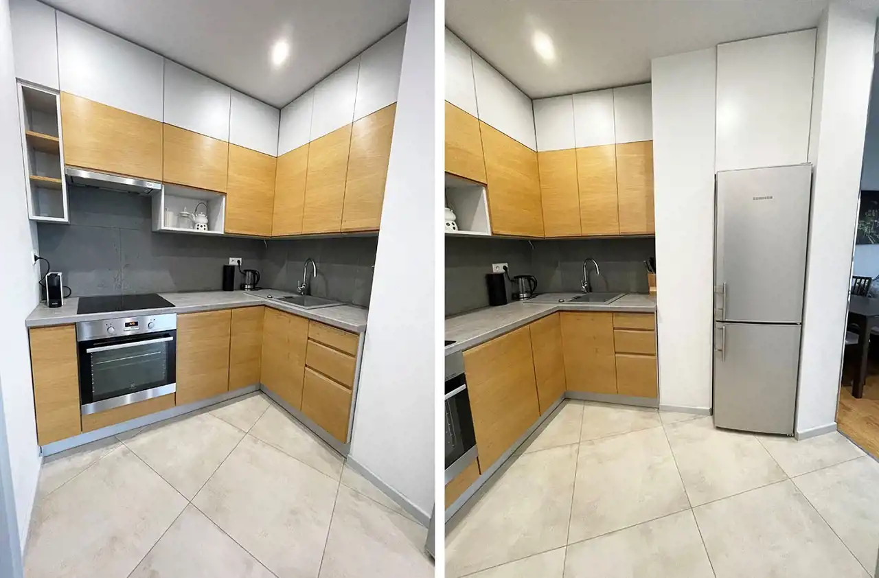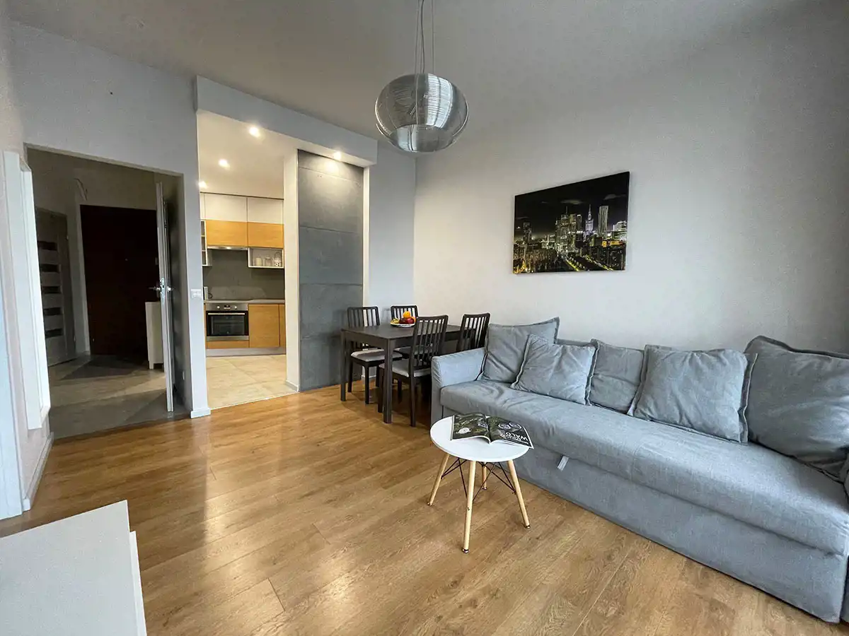 Mieszkanie składa się z częściowo oddzielnej kuchni od salonu. Kuchnia jest wyposażona w lodówkę oraz szafki i AGD w zabudowie (zmywarka, piekarnik, płyta elektryczna, okap kuchenny).