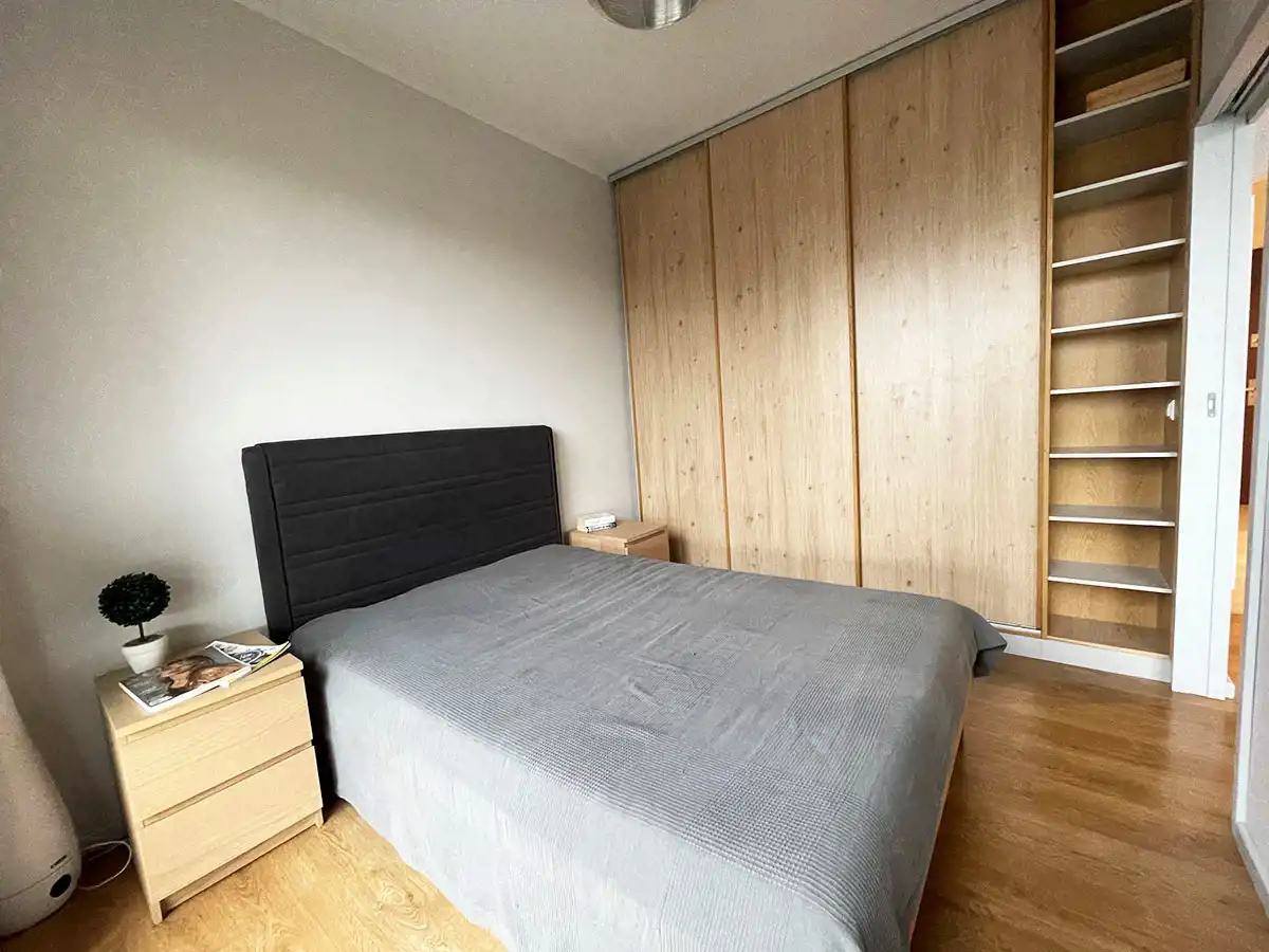 Sypialnia zamykana na przesuwane drzwi, umeblowana w łóżko i pojemną szafę w zabudowie.