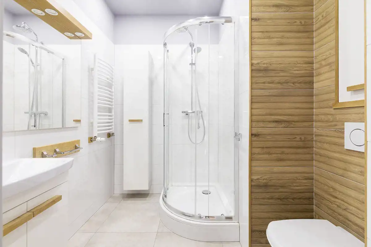 Przestronna łazienka wyposażona w prysznic, umywalkę z szafką, lustro i WC w zabudowie.