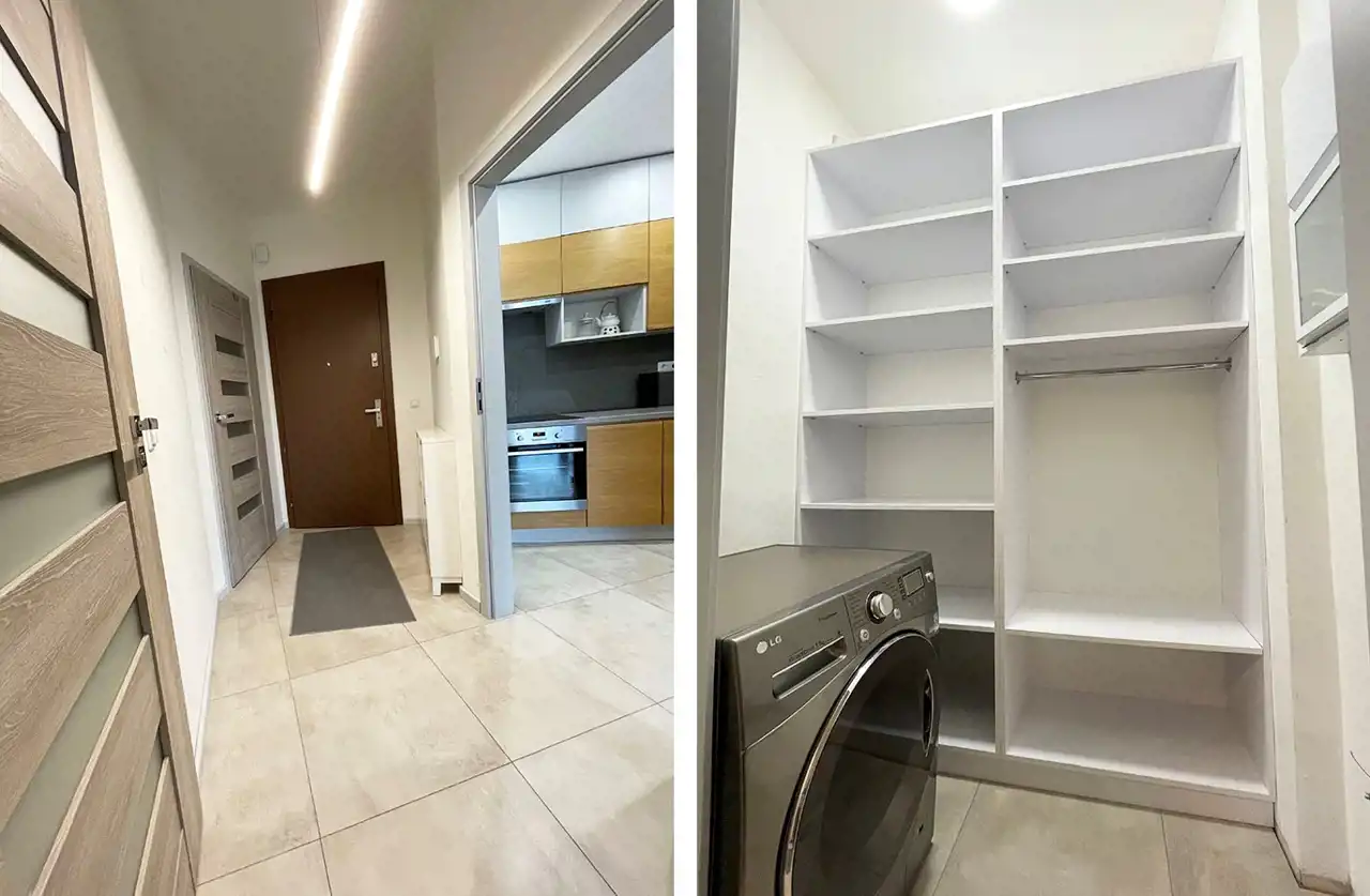W przedpokoju znajdują się szafki na buty oraz garderoba z pralką.