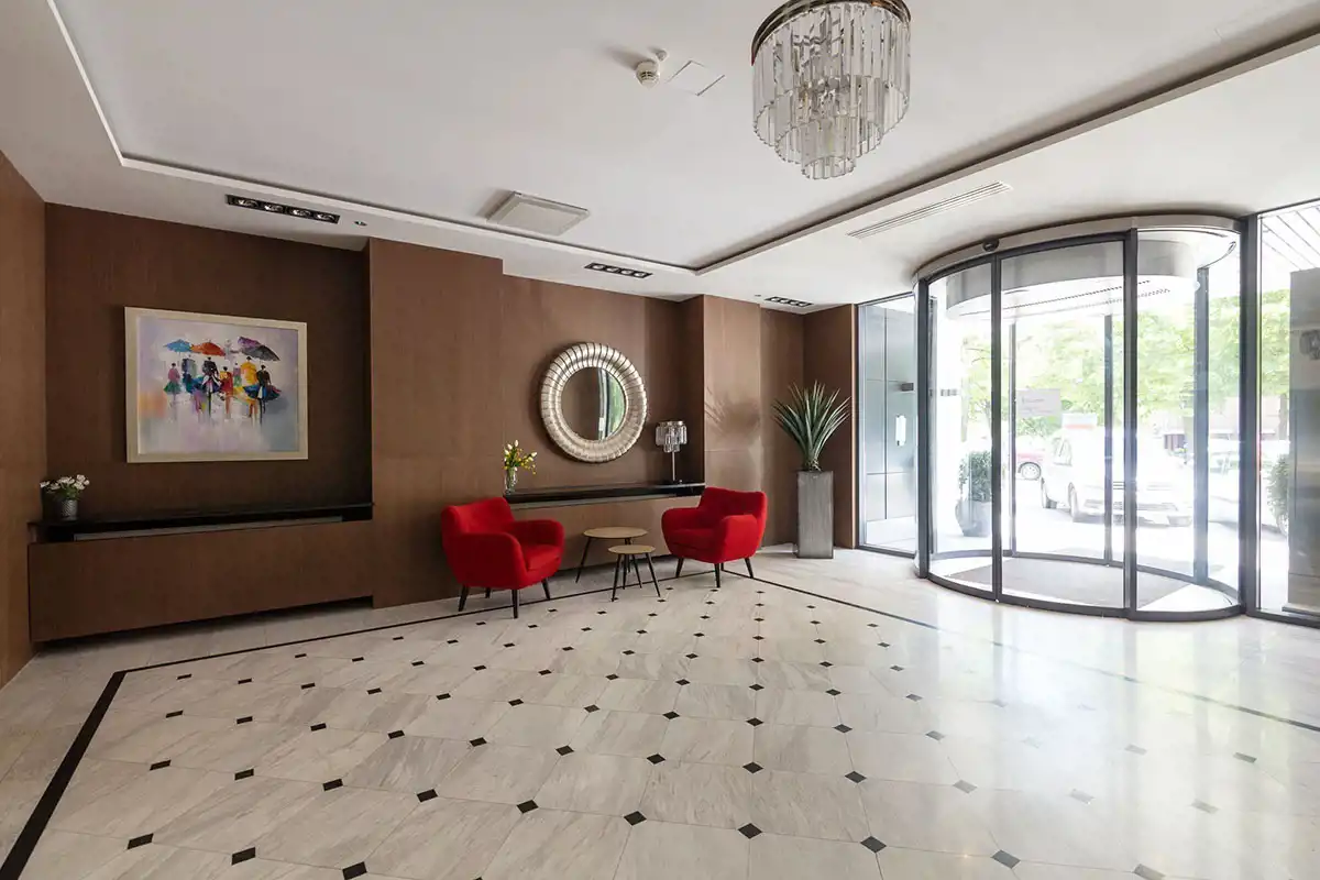 Budynek jest strzeżony 24h przez ochronę, posiada reprezentacyjny hol wejściowy oraz dla użytku mieszkańców basen.