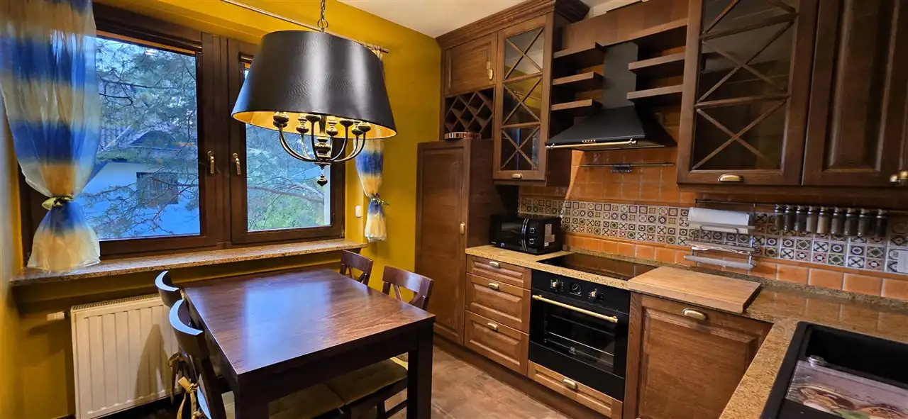 W pełni wyposażona kuchnia w stylu prowansalskim z dużym oknem.