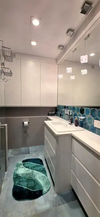 Elegancka łazienka z kabiną prysznicową i wielkim lustrem.