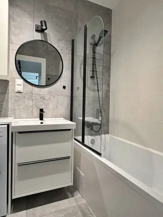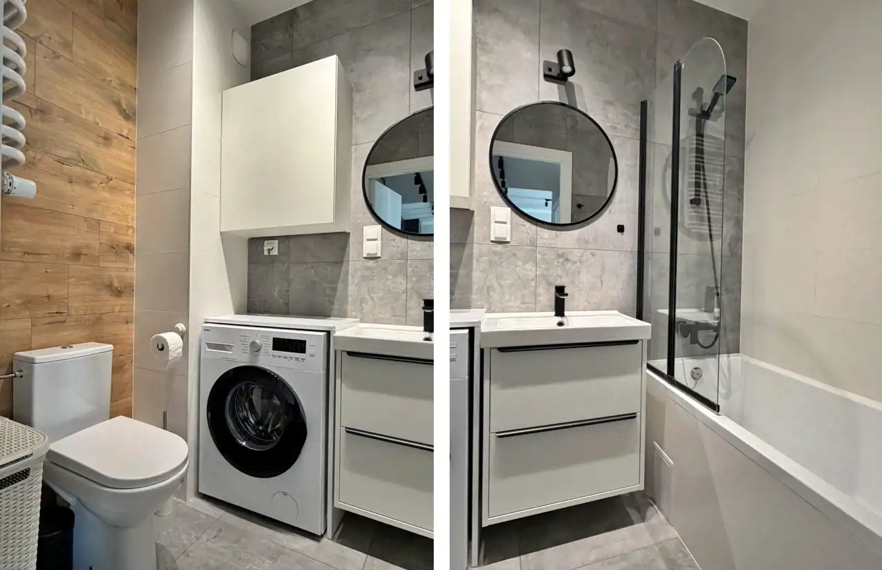 Łazienka - wanna z prysznicem, pralka, umywalka, szafka, WC.