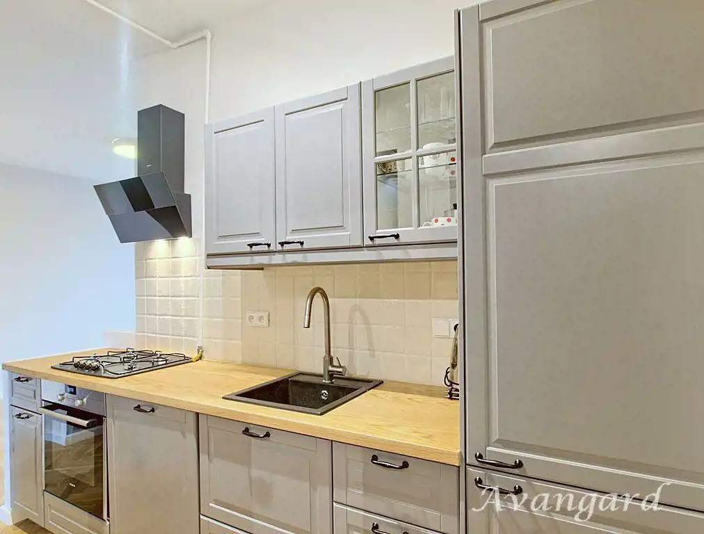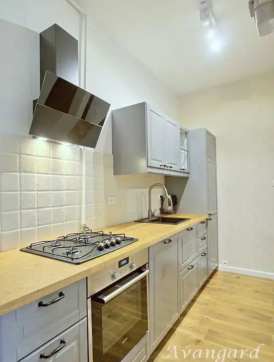 W głębi mieszkania aneks kuchenny przylegający bezpośrednio do salonu.