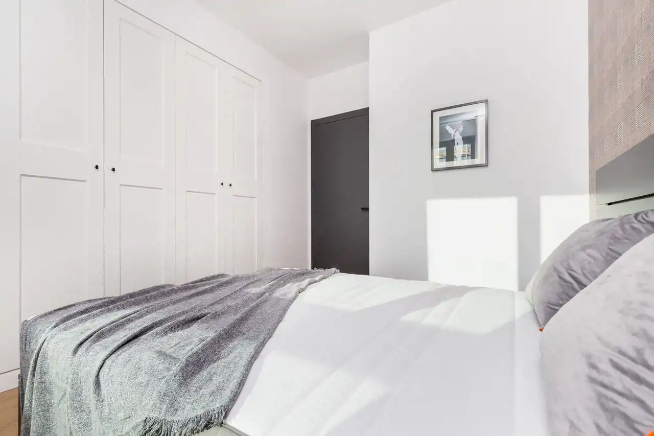 Sypialnia: łóżko małżeńskie, szafa w zabudowie na całej ścianie.