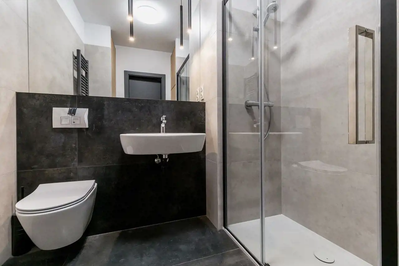 Łazienka: prysznic, pralka, lustro, umywalka.