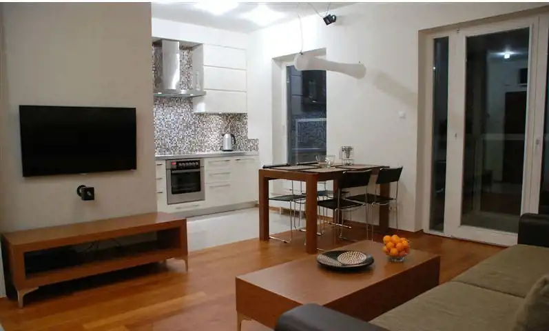 - Salon: sofa rozkładana dla dwóch osób, sprzęt TV i kino domowe, stolik kawowy, stolik telewizyjny, stół rozkładany dla 4(8) osób, 4 krzesła, pojemne szafy wnękowe, półki na książki i płyty;