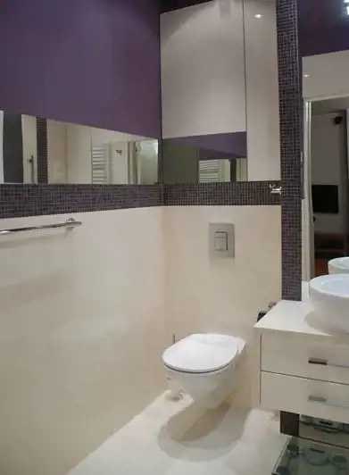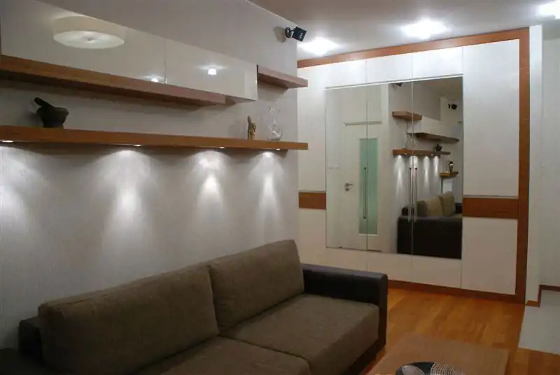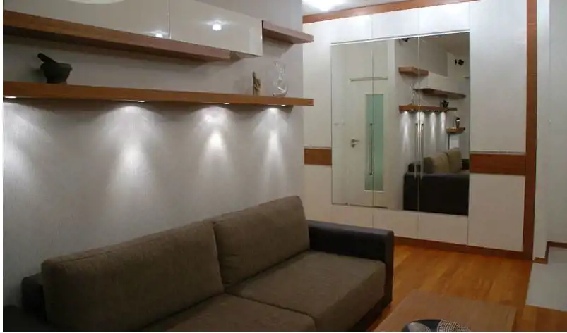 - Garderoba: oddzielona od przedpokoju lustrzanymi drzwiami, z pojemnymi półkami i szufladami.