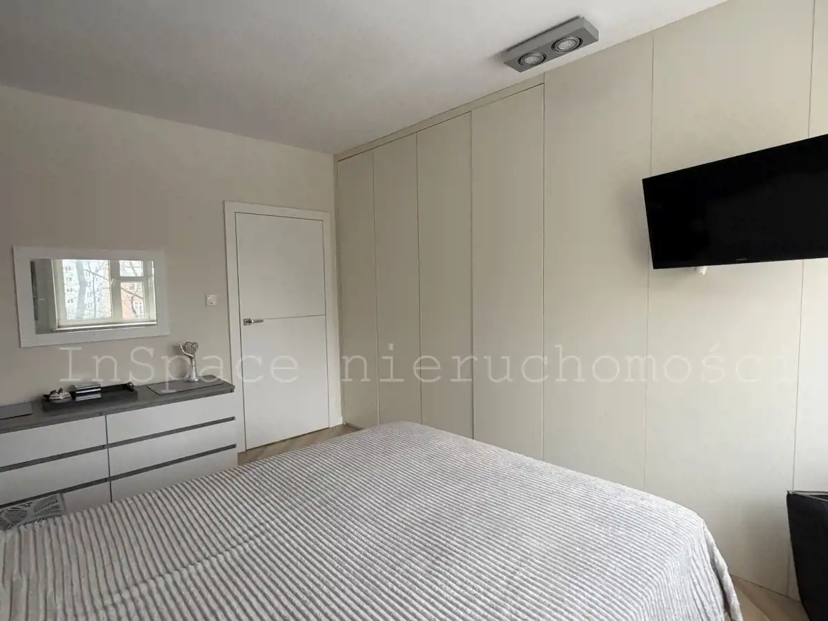-Sypialnia: umeblowana w łóżko małżeńskie, komodę, dużą szafę w zabudowie na całej ścianie, telewizor.