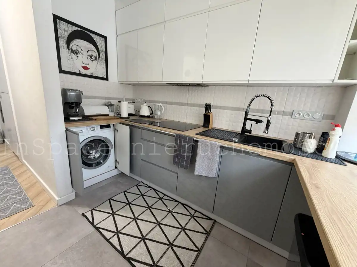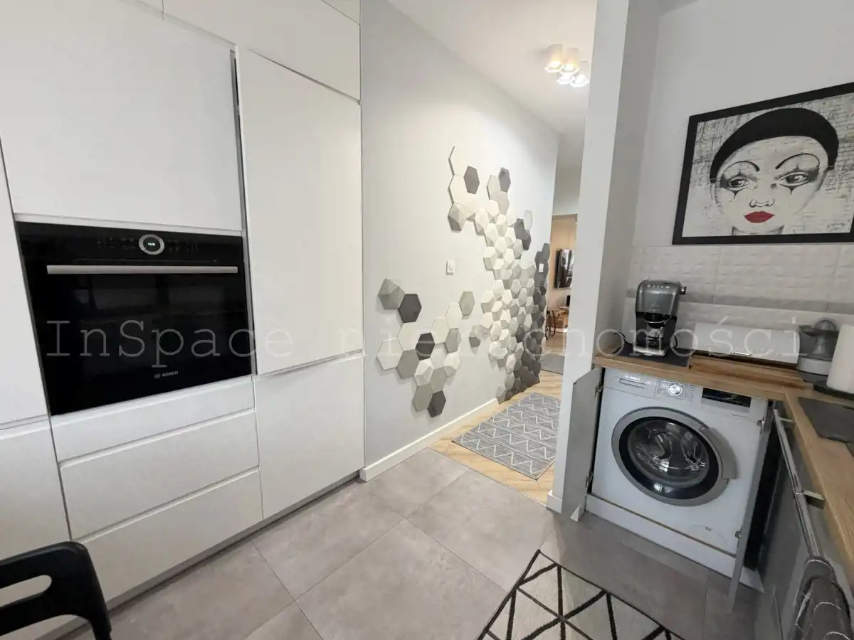 -Aneks kuchenny: lodówka, piekarnik, zmywarka, płyta indukcyjna, pralkę, okap kuchenny, wyposażenie kuchni.
