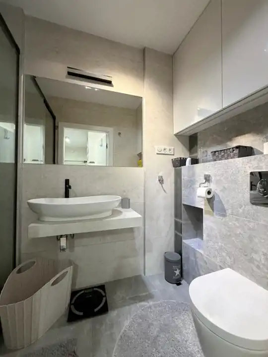 -Łazienka: wyposażona w dużą kabinę prysznicową, umywalkę, szafki oraz WC.
