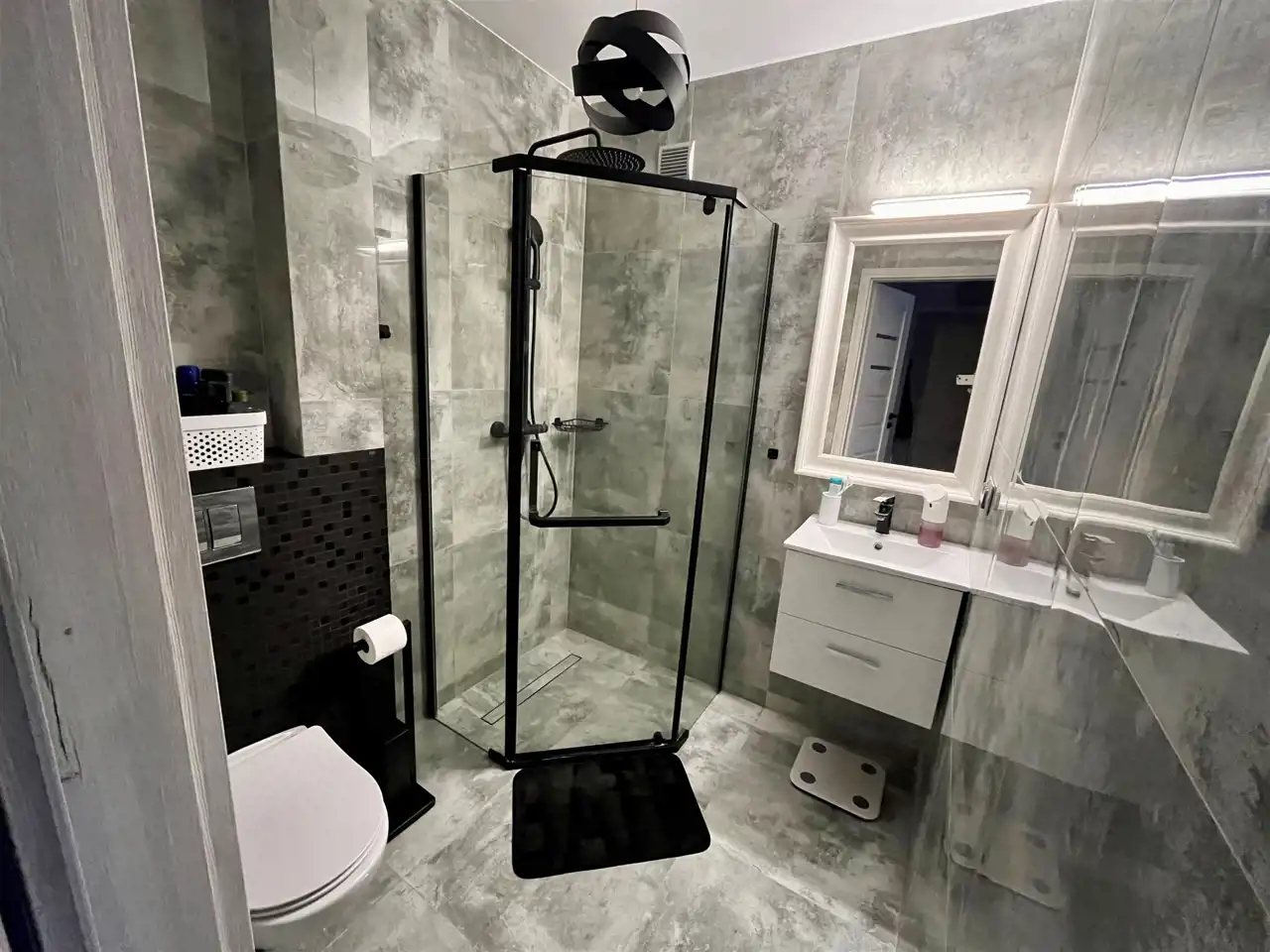 - łazienki w jasnych, nowoczesnych kolorach z kabiną prysznicową,
