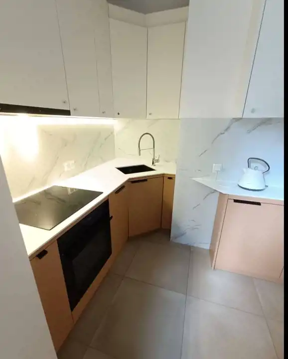 Kuchnia - zabudowa pod wymiar z dużą ilością szafek i z cienkimi blatami kompaktowymi fimy Forner wykonanymi w całości z laminatu (10 mm) w pełni wyposażona: lodówka , zmywarka, mikrofalówka, piekarnik firmy Amika z funkcją czyszczenia - pyrolizą, płyta indukcyjna Amica z funkcjami timera, łączenia pól (Autobrigde), maksymalnej mocy (Powerbooster), okap o dużej mocy, stół i 2 krzesła. Kuchnia posiada okno z roletą "dzień noc" skierowane w kierunku zachodnim ( na taras).