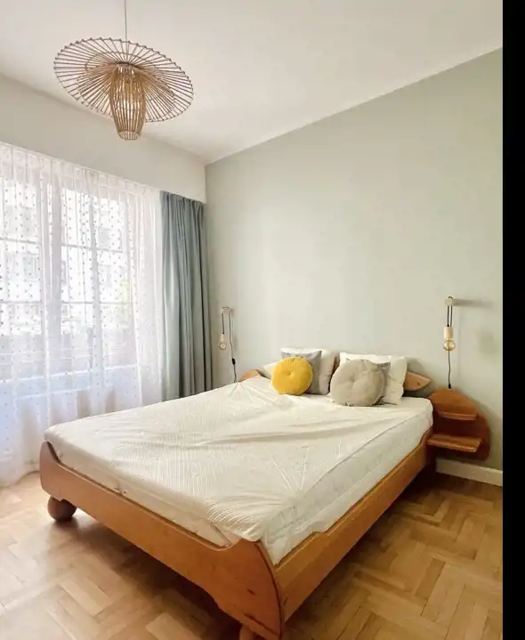 Sypialnia – łóżko drewniane z półeczkami z boku z materacami kieszeniowymi o szerokości spania 1,6 m, 2 kinkiety, duża zabudowana szafa przesuwna z lustrem ( do pełnej wysokości 2,97 m), półeczki obok szafy przesuwnej, firanki , zasłony, stylowe oświetleni górne. Okno sypialni skierowane jest w kierunku wschodnim na patio znajdujące się na tym samym piętrze (brak hałasu).