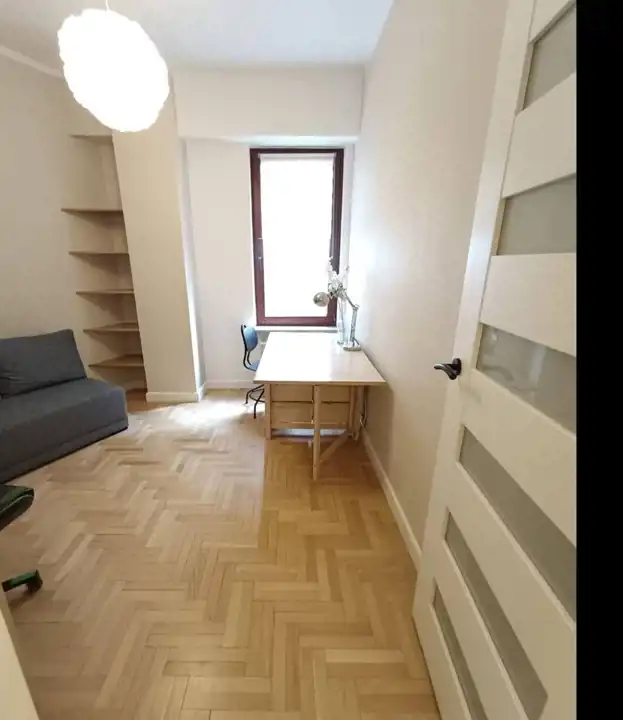 Pokój dziecka/gabinet – rozkładana sofa, stół z możliwością rozłożenia z szufladkami, słupek , krzesło obrotowe, fotel , lampka na stół do pracy. Okno pokoju posiada roletę ”dzień noc” i skierowane jest w kierunku wschodnim na patio ( brak hałasu).