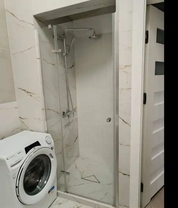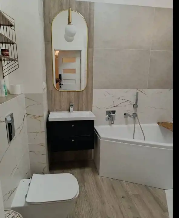 Łazienka – wanna, osobny wygodny prysznic z deszczownicą bez brodzika (odpływ w podłodze), lustro,umywalka z szafką podwieszaną, podwieszana miska klozetowa z deską wolnoopadającą, półeczki metalowe nad deską klozetową, pralka.