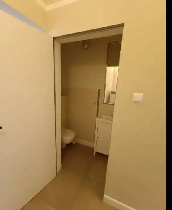 Osobna toaleta oprócz łazienki – szafka z umywalką, lustro, miska klozetowa podwieszana z deską wolnoopadającą.
