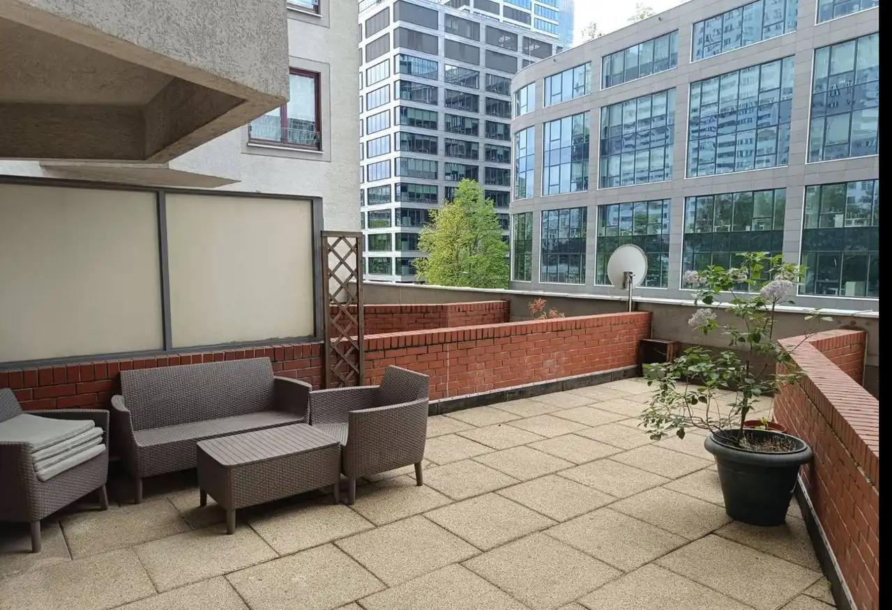 Obok mieszkania na tym samym piętrze dostępne jest dla mieszkańców patio z ławkami oraz zieloną roślinnością.