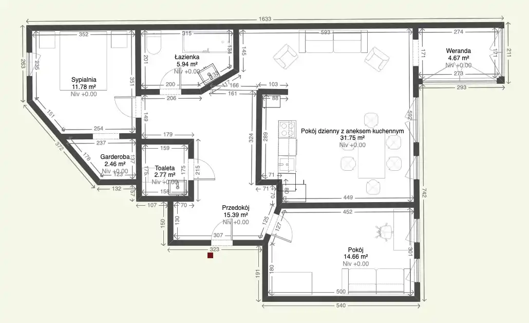 - dodatkowego pokoju (ok. 14,5 m²), który może pełnić funkcję sypialni, gabinetu lub pokoju dla dziecka,