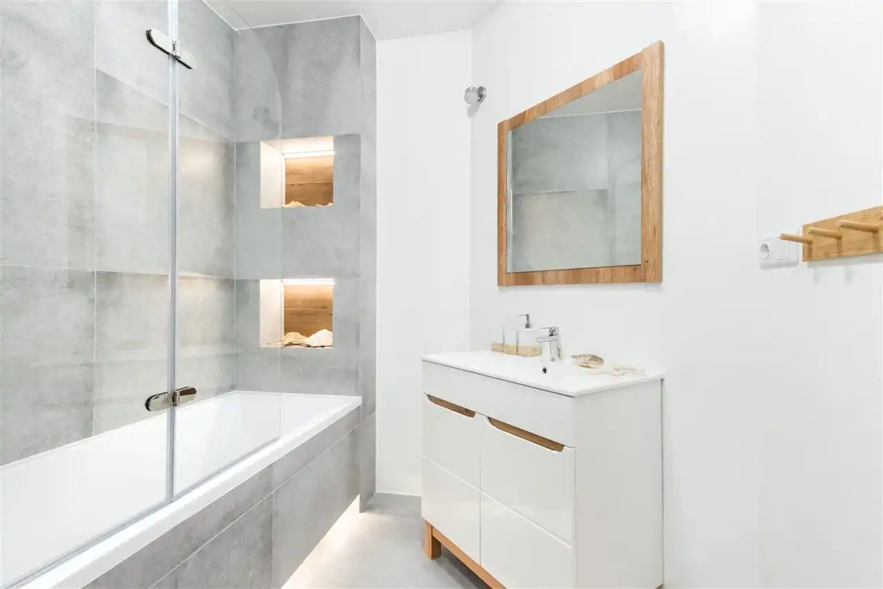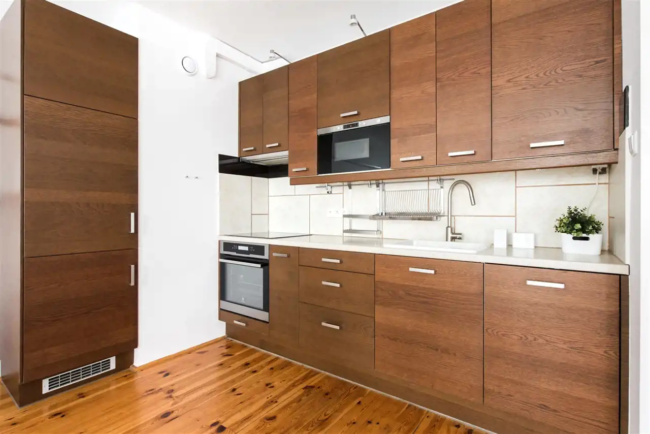 Apartament jest w pełni umeblowany i gotowy do zamieszkania. Został urządzony z wykorzystaniem materiałów wysokiej jakości – drewno w aranżacji wnętrz nadaje mu elegancji, ponadczasowego stylu i ciepła.
