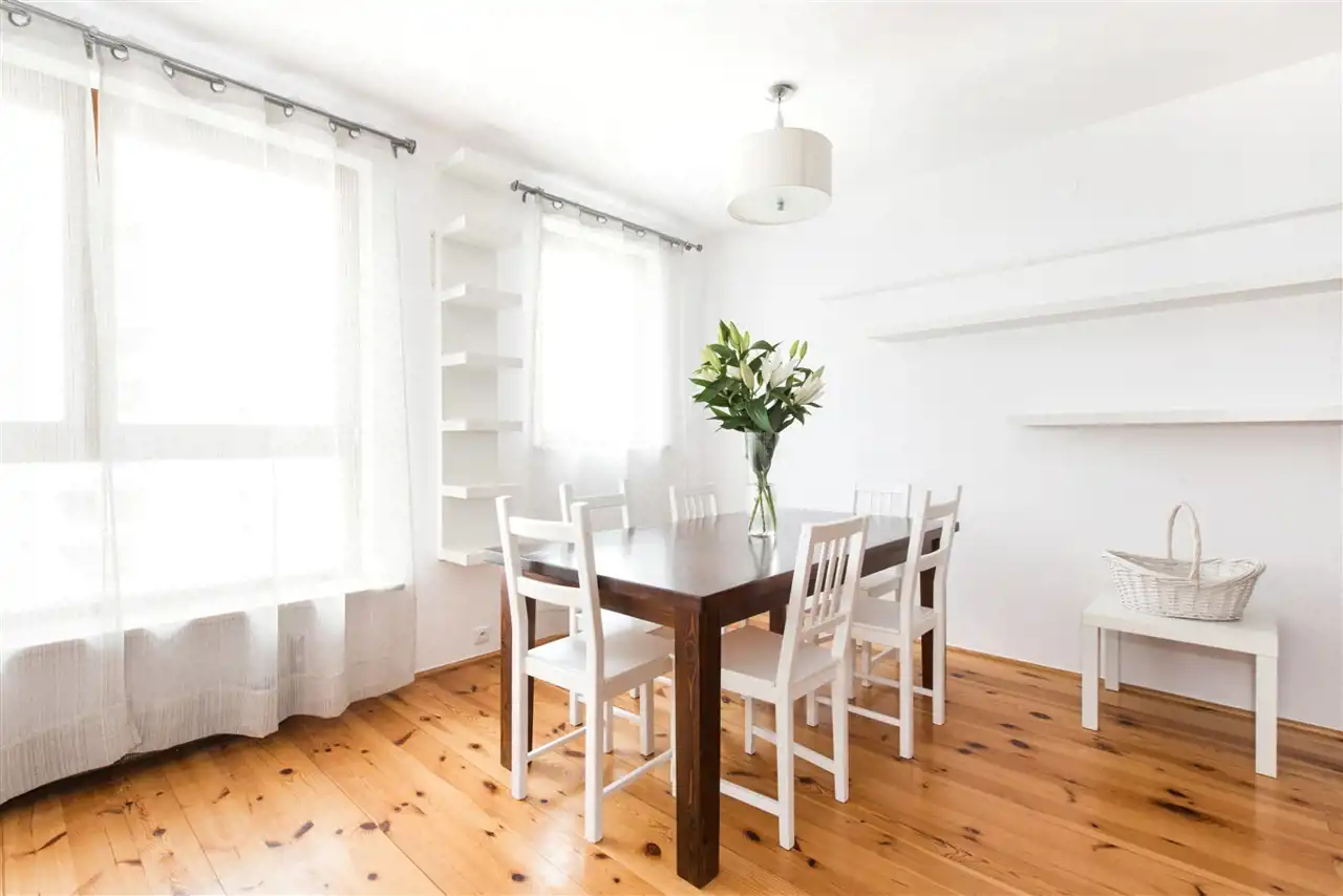 Apartament o powierzchni 90 m² znajduje się na VI piętrze w budynku z cegły z 2000 roku, wchodzącym w skład prestiżowego Osiedla Prezydenckiego. Dzięki przemyślanemu, dwustronnemu układowi (orientacja północny-wschód oraz południowy-zachód) wnętrze jest pełne naturalnego światła przez cały dzień.
