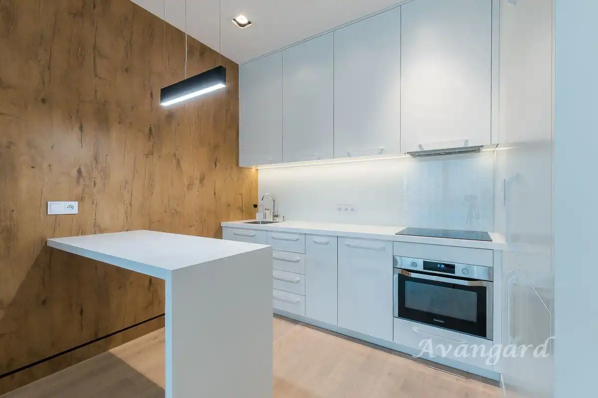 Kuchnia z zabudową wykonaną na wymiar, wyposażona w sprzęty AGD. Dodatkowo wygodny barek.