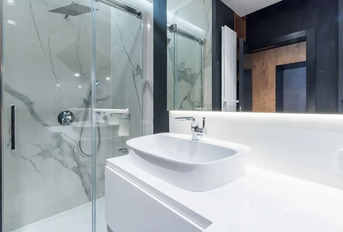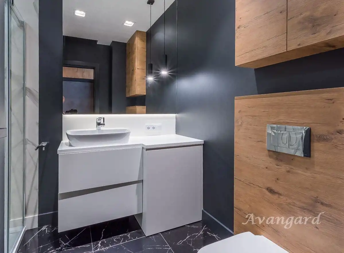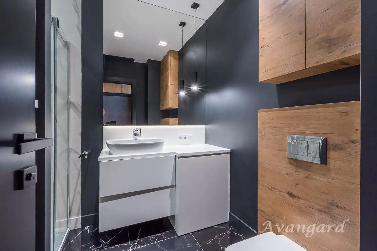 Łazienka z prysznicem typu walk in, umywalką, licznymi zabudowanymi schowkami i toaletą.