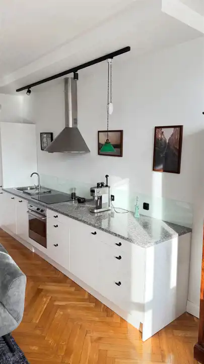 Mieszkanie składa się z pięknego, przestronnego i słonecznego salonu połączonego z kuchnią z wyjściem na balkon, dużej sypialni z bardzo dużą szafą w zabudowie, oraz drugiego pokoju przeznaczonego na gabinet do pracy lub pokój dla dziecka, dodatkowo łazienka z wanną oraz aneksem prysznicowym. Mieszkanie jest dwustronne, salon z kuchnią wychodzą na Plac Narutowicza a sypialnie na ciche podwórko. Wysokość mieszkania ponad 3 m!