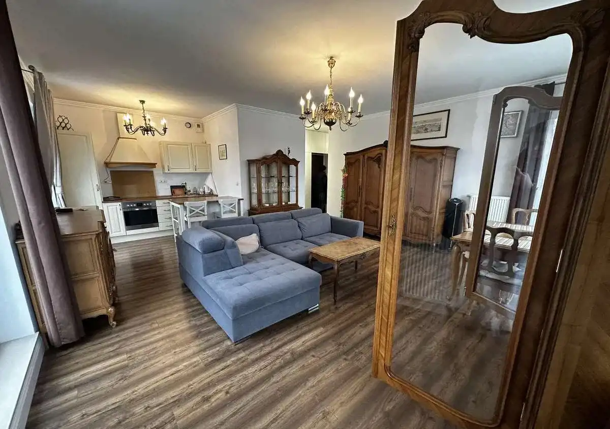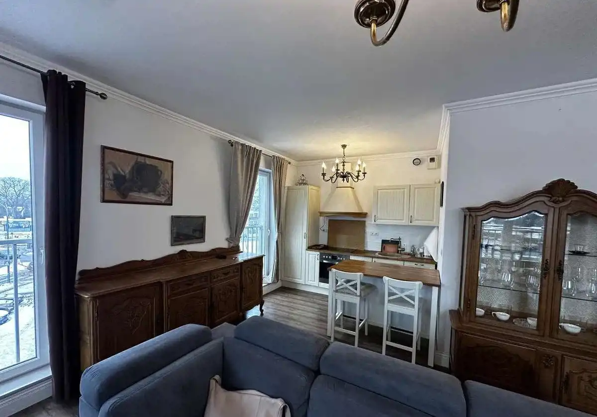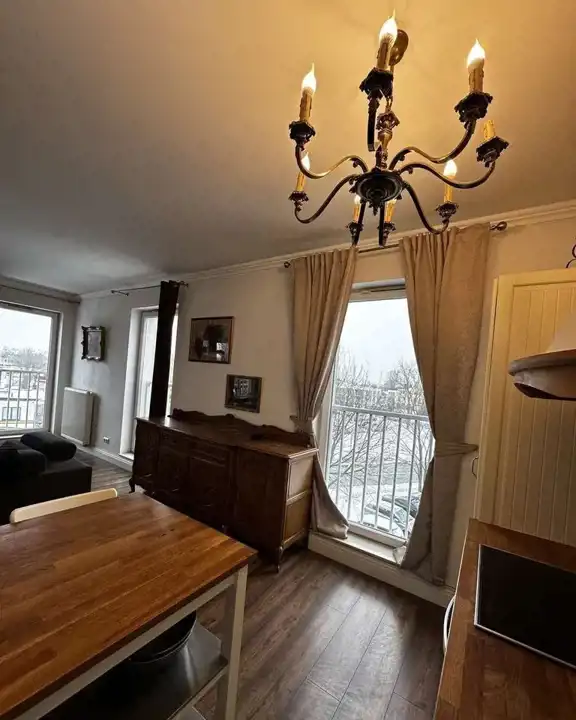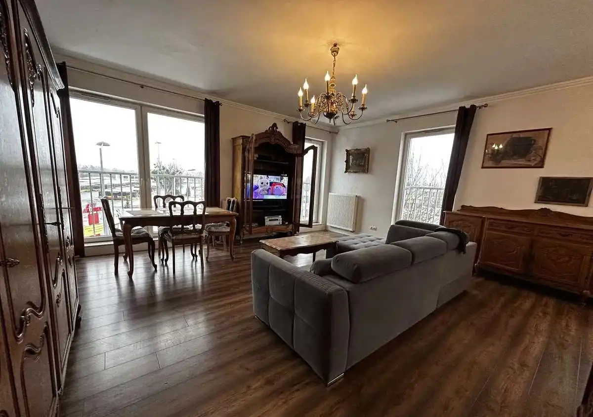 Mieszkanie znajduje się na 2. piętrze w 7-piętrowym bloku z 2014 roku. W skład mieszkania wchodzą: 3 pokoje, oddzielna kuchnia oraz łazienka. W pełni umeblowane i wyposażone w sprzęt AGD: pralka, suszarka, zmywarka, lodówka, piekarnik oraz telewizor. Do mieszkania przynależy balkon i 3 komórki lokatorskie.
