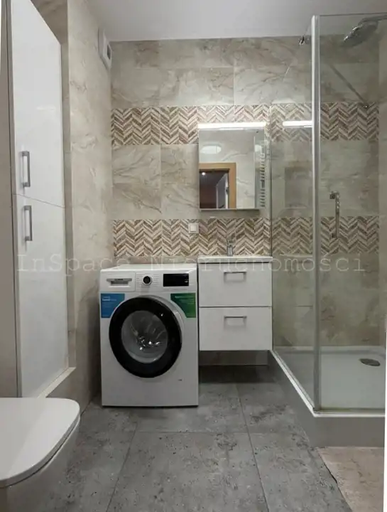 Łazienka - prysznic, pralka, umywalka, szafka, lustro, WC.