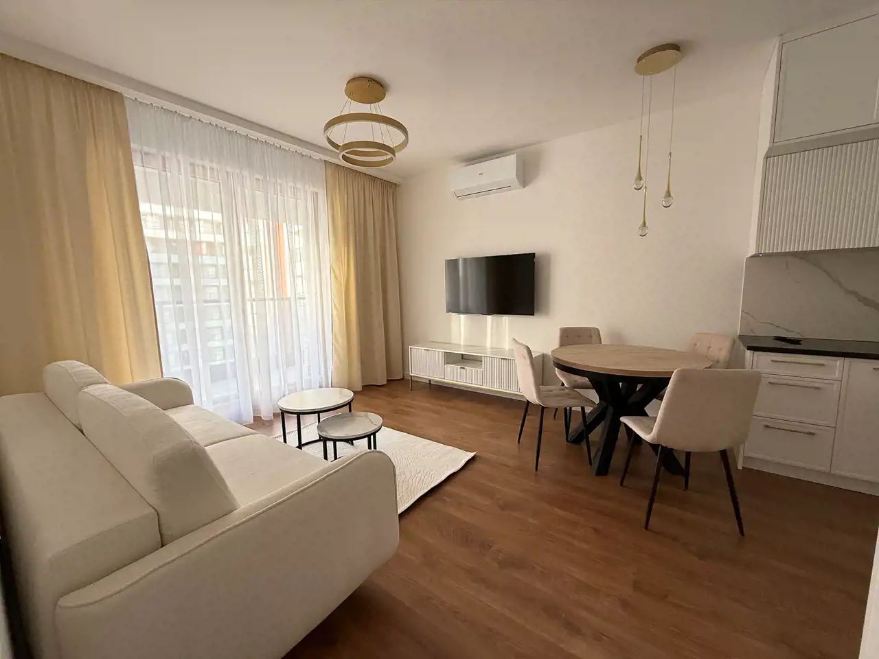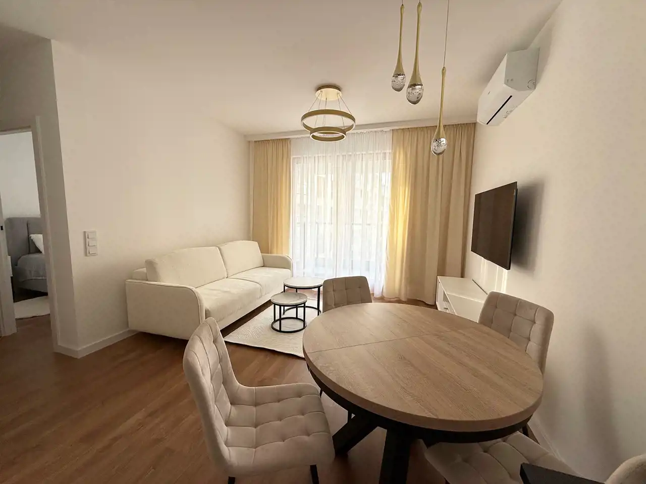 Salon umeblowany jest w sofę, stół z krzesłami, TV oraz z wyjściem na balkon.