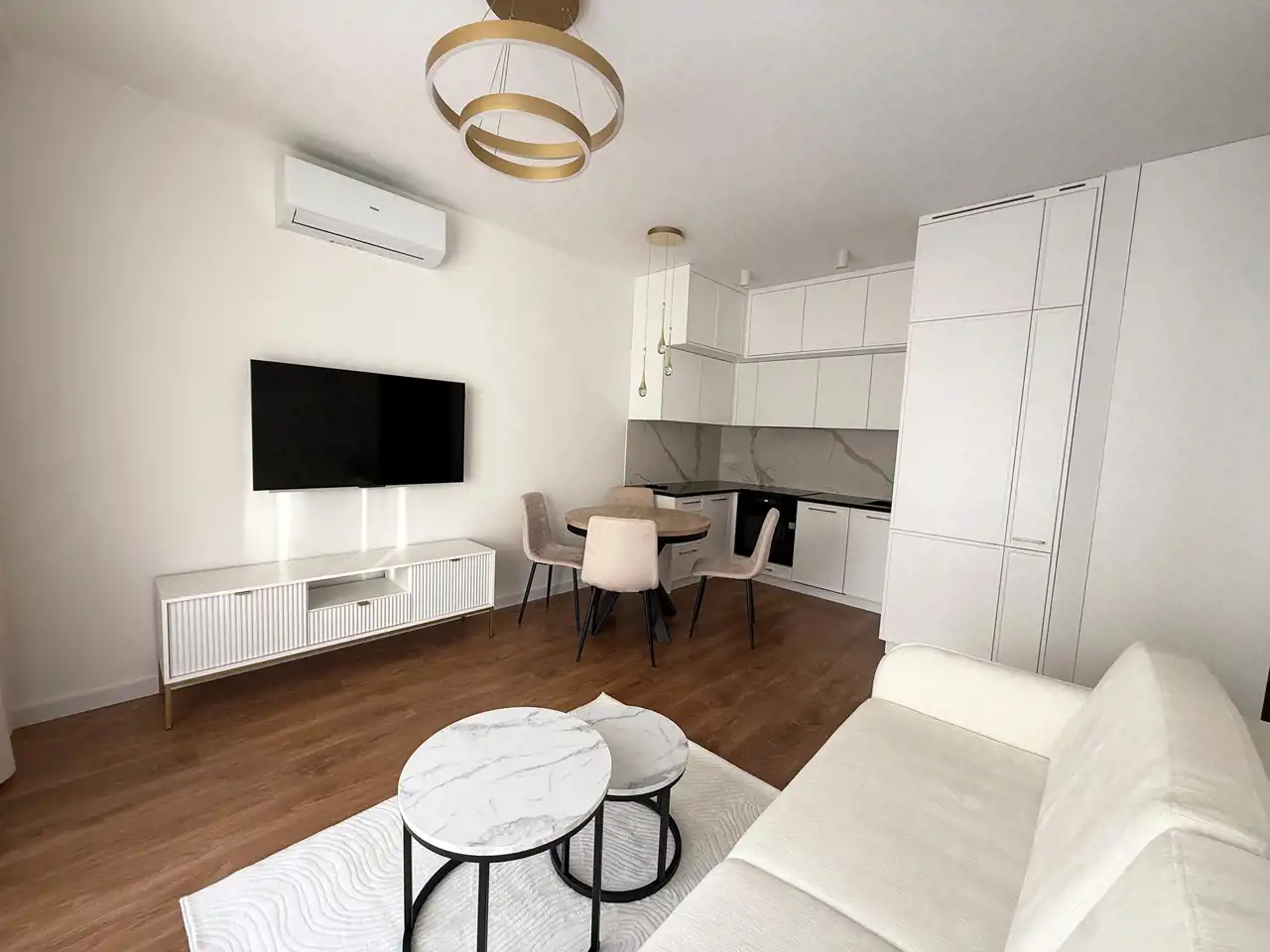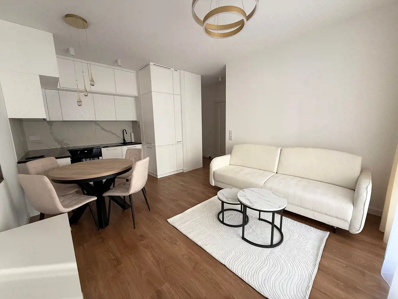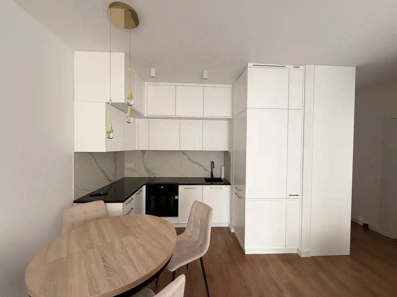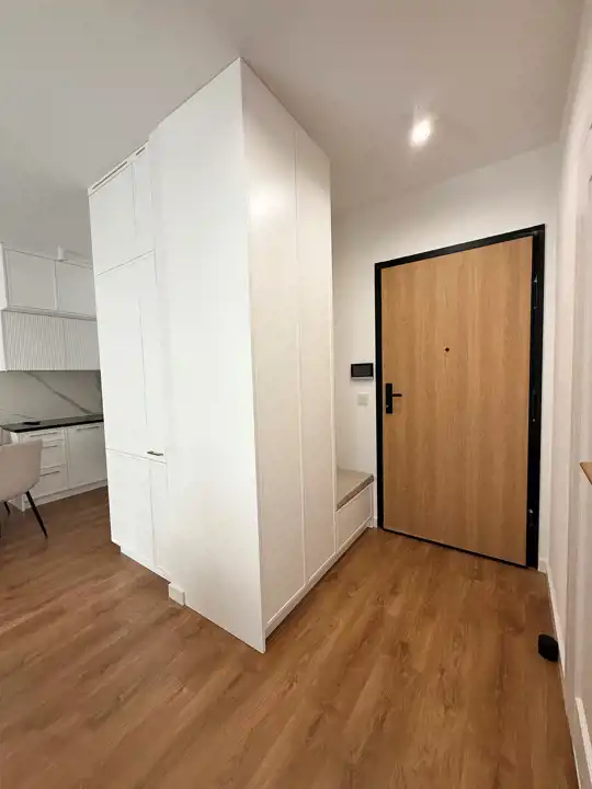Mieszkanie składa się z otwartej na salon kuchni w zabudowie (lodówka, zmywarka, piekarnik, płyta indukcyjna, okap kuchenny). Blat kuchenny wykonany z granitu.